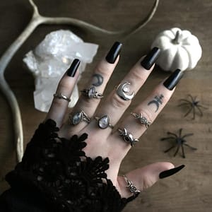 Sterling silver rings with moonstones on a hand with long black nails and tattoos, on crescent moon tattoo and one tattoo with occult symbols.