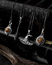 A luminous Tiger’s Eye Stone pendant with intricate details in Sterling Silver. Tiger’s Eye is known as the “Shape-shifter” due to its ever-changing glow & as legend says it can preferably be worn to boost your courage when needed. Every pendant is unique & hangs in a black vegan suede choker with adjustable endings.