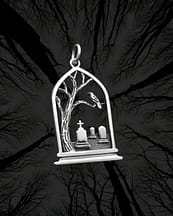 You will love this silver necklace if you have an eye for details. The frame of the pendant is shaped like a Gothic arch window displaying a miniature of a graveyard scene. Fine detail. Recycled Silver. Non-allergenic.